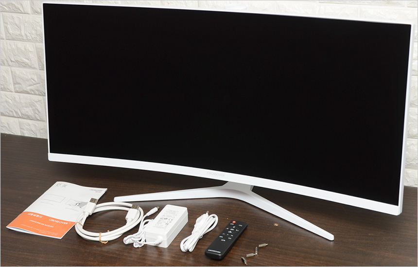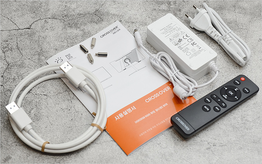 구성품의 모습으로 모니터를 비롯해 전원 어댑터와 전원케이블이 제공되며 설명서와 DP 케이블, 리모콘이 포함된 것을 확인할 수 있다. 뿐만 아니라 벽에 걸어 사용하는 유저들을 위해 베사 연장볼트도 제공된다.