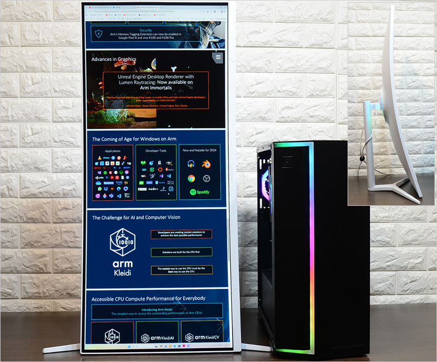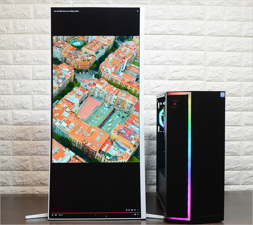 멀티스탠드 탑재로 활용성을 높인점에도 좋은 점수를 주고 싶다. 화면 크기가 상당히 커 틸트만 지원하면 원하는 시야환경을 만들기 힘들지만 스위블과 엘리베이션이 추가로 지원해 사용자에게 맞게 모니터 위치를 조정할 수 있었으며 공식적으로 지원한다는 언급은 없지만 피벗 설정도 가능해 엄청난 대화면으로 세로영상을 즐길 수 있었다.