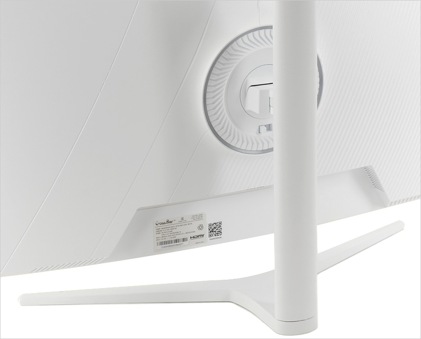 모니터 하단의 모습으로 중앙에 크로스오버 문구가 세겨진 것을 확인할 수 있으며 2개의 3W 스피커와 통풍구가 제공되는 것을 확인할 수 있다. 또한 측면에는 모니터 설정을 위한 OSD 버튼과 상태표시 LED를 지원한다. (리모콘이 기본 제공되어 편하게 모니터 기능을 설정할 수 있다.)