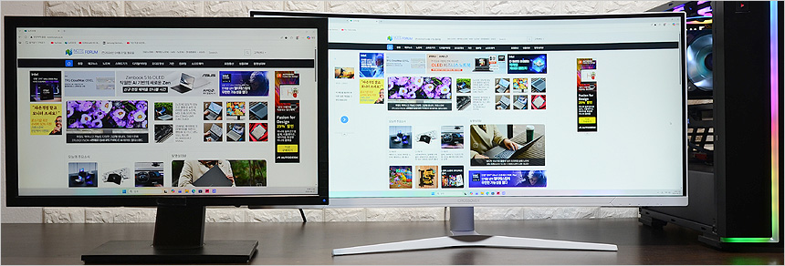 두 대의 모니터를 셋팅한 김에 베젤 두께를 확인해 보았는데 구형 모니터와 큰 차이를 보여주었다. 슬림 베젤을 적용한 모델로 높은 몰입감을 경험할 수 있을 것이다.