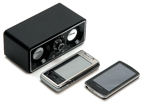 기기 전면부의 모습으로 양 측면에 1.5인치 유닛이 장착된 것을 확인할 수 있다. (디바이스의 전원을 사용하는 일반 포터블 스피커와 달리 배터리가 내장되어 훨씬 박진감 넘치는 사운드를 즐길 수 있다.) 또한 중앙에 볼륨조절 레버를 장착했으며 이어폰 및 MP3P 연결 단자도 지원하는 것을 확인할 수 있다. (포터블 스피커지만 편의성에 상당히 신경 쓴 것을 확인할 수 있다. 이어폰이나 각종 디지털 디바이스를 간편하게 연결할 수 있으며 빠르게 볼륨을 컨트롤 할 수 있다.)