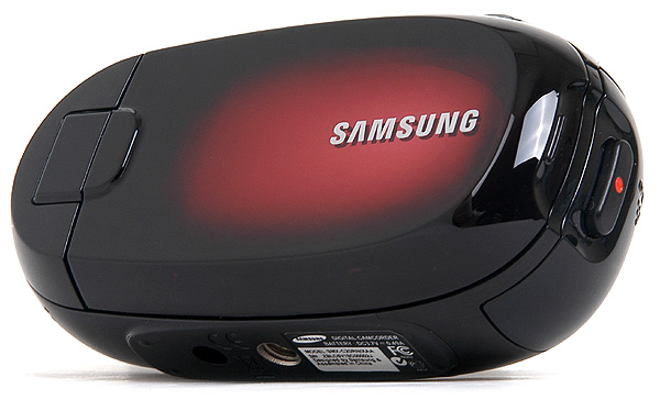 우측면 내부의 모습으로 내장 스피커와 다양한 버튼이 부착되어 있는 것을 확인할 수 있다. 전원 버튼 및 재생, 화면표시, 공유 버튼이 부착되어 있으며 삼성 디지털카메라에 적용되어 유저들에게 큰 호응을 얻고 있는 스마트 오토 기능버튼도 지원하는 것이 눈에 띈다. (만족스런 화질의 영상을 간편하게 촬영하고자 하는 유저들에게 어필할 수 있을 만한 기능이다.)