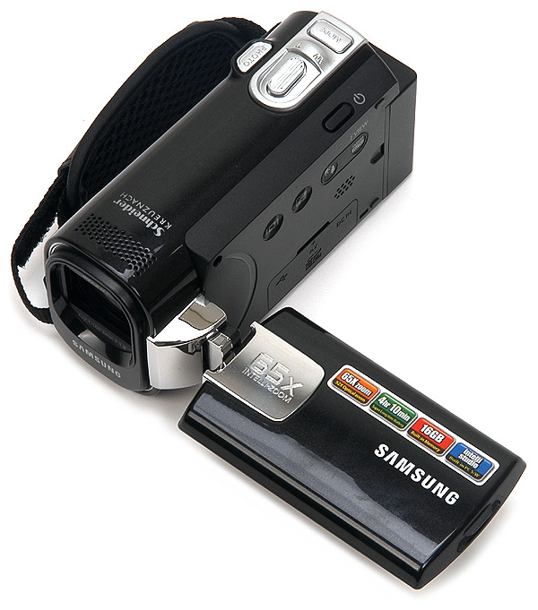 기기 우측면의 모습으로 기존 제품들과 같이 회전 LCD가 장착되어 자유롭게 앵글을 설정할 수 있으며 손쉽게 촬영된 동영상을 재생할 수 있다. (후면부에 홈이 파여 있어 LCD를 손쉽게 열고 닫을 수 있다.) 상단에서 말씀드린 것과 같이 65X의 인텔리 줌을 지원하며 16GB의 내장 메모리가 지원되어 장시간 동영상 촬영시 저장용량에 대한 걱정을 할 필요가 없다.