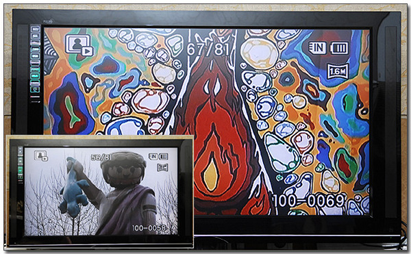 동영상 뿐만 아니라 촬영한 사진도 간편하게 감상할 수 있다. (슬라이드 쇼를 기본 지원한다. PC로 볼 때와 달리 무척 선명하게 사진을 재생하기 때문에 온가족이 촬영된 사진을 간편하게 감상할 수 있다.)